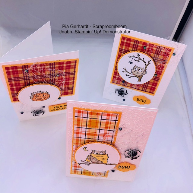 Das Thema ist Halloween und ich habe ausnahmsweise Karten für Halloween gestaltet. Normalerweise sende ich keine Karten dazu, sondern schenke nur Süßigkeiten. Aber das Set Eulenfest ist einfach so süß, dass ich dachte, dieses mal gibt es auch ein paar Karten.