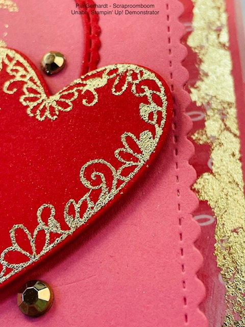 Mit Deko-Metallblättchen bekommt man ein ganz anderen Ergebnis als mit goldenen Embossingpulver. Die ganz filigranen Motive sind nicht so scharf abgebildet, sondern bleiben etwas rauer. Aber es schimmert wirklich schön!