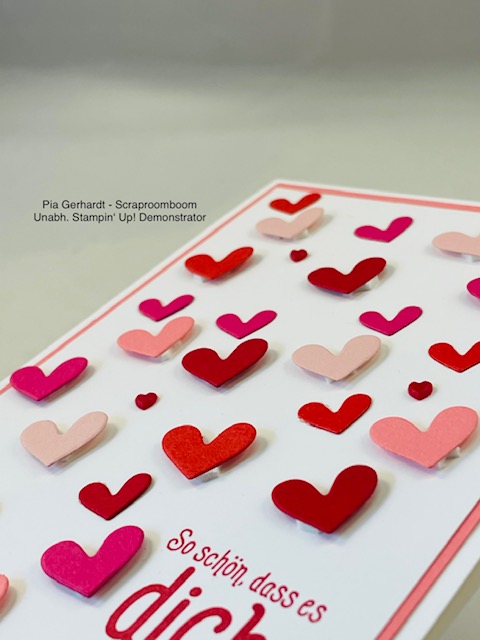 Heute noch zwei Karten mit Herzen. Ihr könnt sehen, dass das Set Ganz viel Herz mit den passenden Stanzformen Reihenweise Herzen richtig gut gefällt. Die erste Karte ist zwar ein bisschen Arbeit, aber für einen lieben Menschen macht man doch sowas gerne,