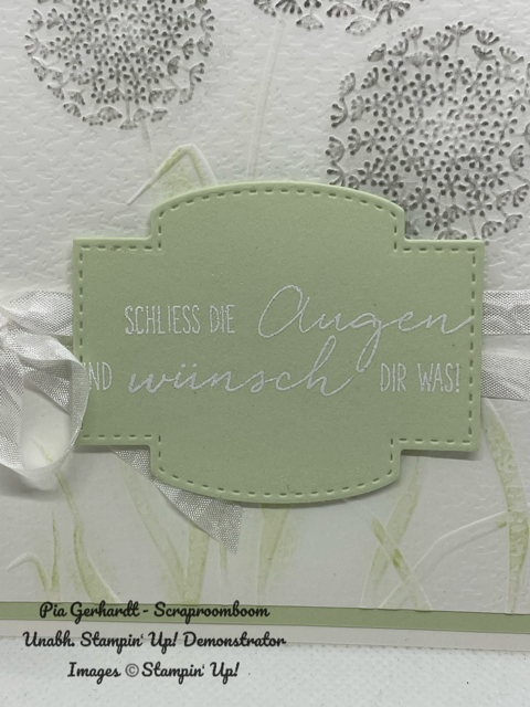 Ich habe euch heute eine ganz einfache Karte mit zarten Farben, aber mit einer Prägetechnik: Doppeltes Prägen. Zuerst habe ich meine Karte mit 3D-Prägefolder Textil mit Stil geprägt und danach noch mit 3D-Prägefolder Pusteblumen geprägt. Damit bekommt man beide Muster auf der Karte.